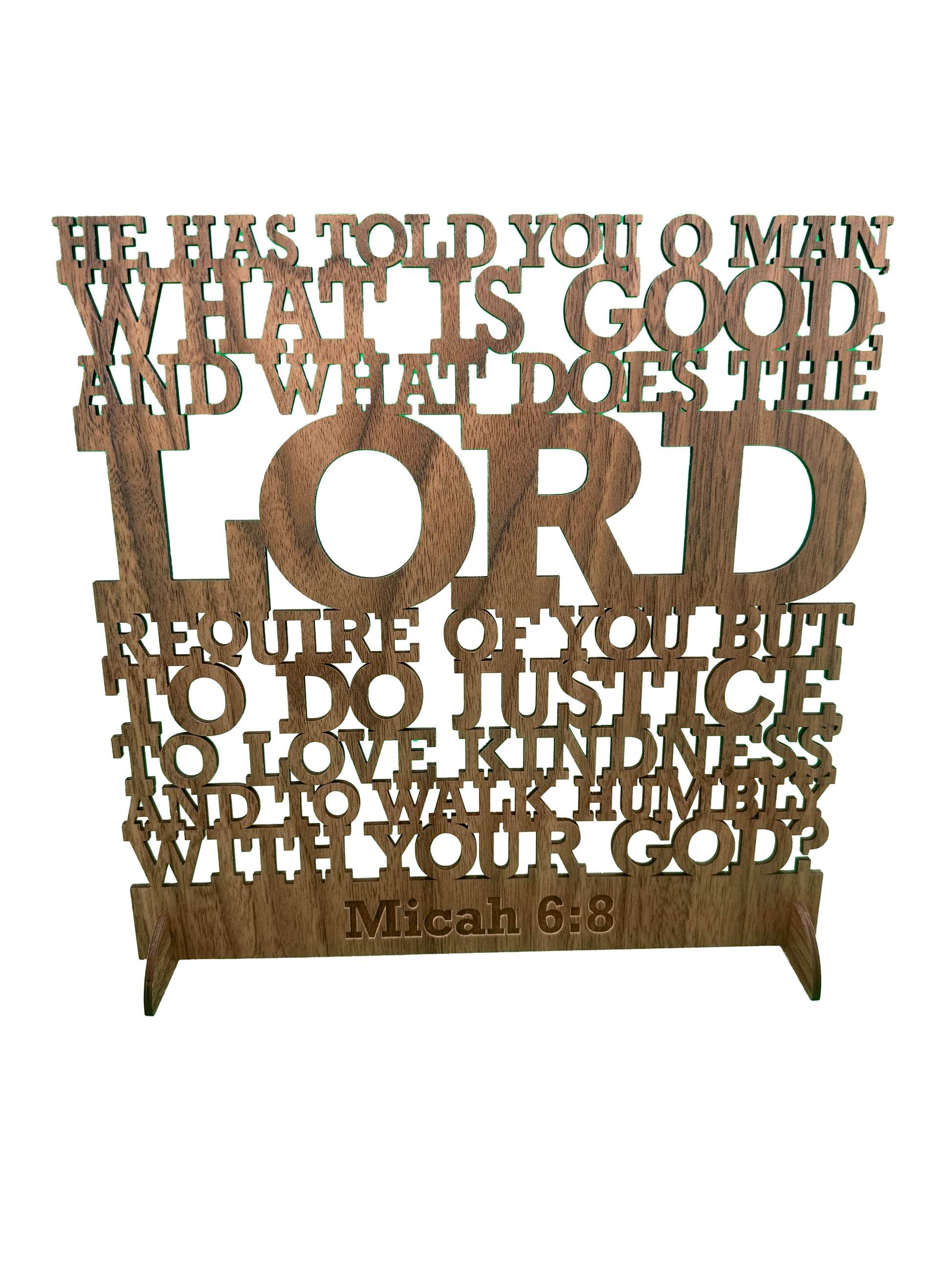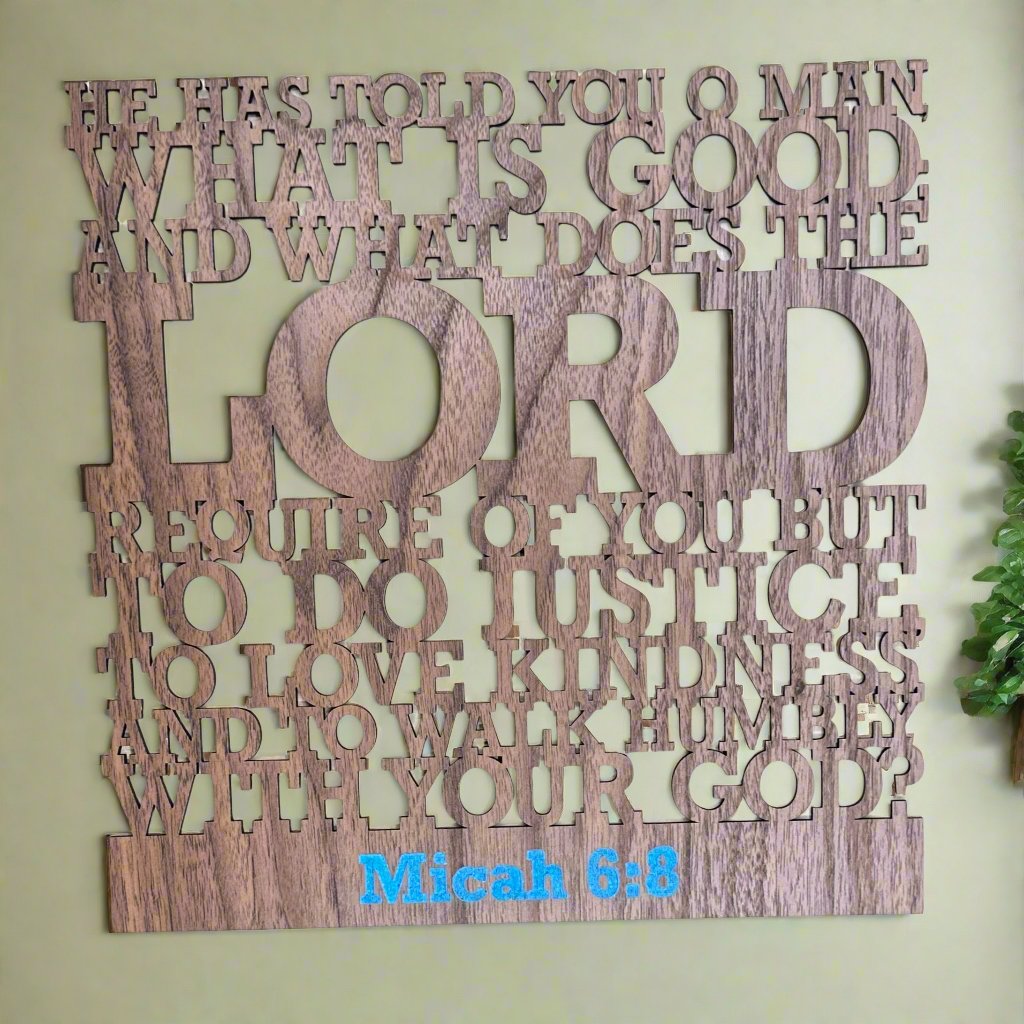 This elegant wooden sign showcases the powerful scripture from Micah 6:8: "He has told you, O man, what is good; and what does the Lord require of you but to do justice, to love kindness, and to walk humbly with your God?" The timeless verse is beautifully inscribed in a classic font, adding warmth and inspiration to any room. With its natural wood finish, this decor piece exudes rustic charm while offering a profound reminder of living with justice, kindness, and humility. A perfect addition to your home, it brings both spiritual reflection and aesthetic grace to your space.